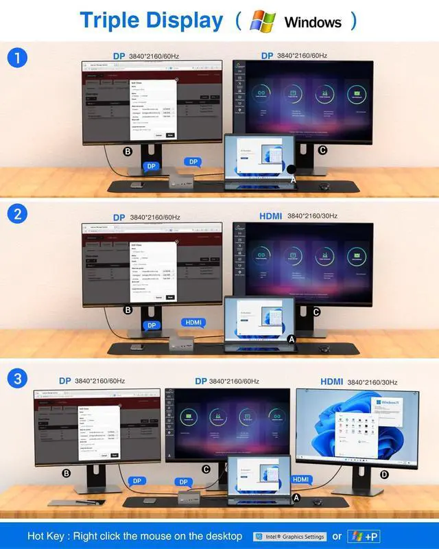 High Resolutions: DisplayPort outputs and Gigabit Ethernet via DisplayLink DL-6950 "Alt Mode". HDMI port supports up to 3840x2160 4K@30Hz. DisplayLink DisplayPorts support up to 4K@60Hz.