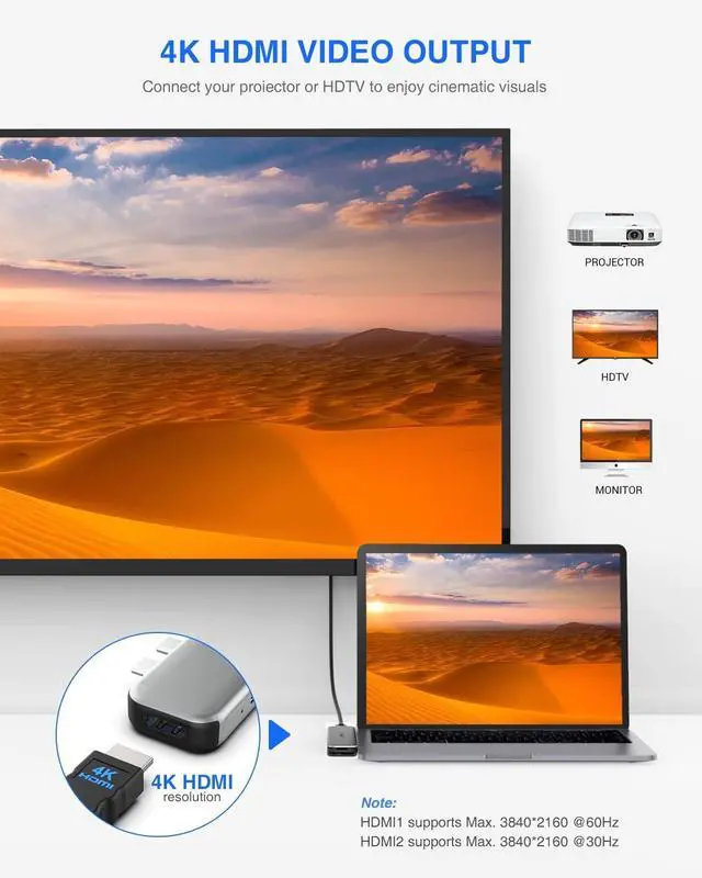 HDMI Output: This MacBook USB C hub supports triple display with MacBook + HDMI1 + HDMI2 (except for the M1 chip MacBook Pro/Air). Thus you are able to mirror or expand your MacBook Pro/Air screen to external two TVs, monitors, or projectors, ect. Bringing you a theatrical visual feast and boosting your efficiency 3 times more. ^^ Strong