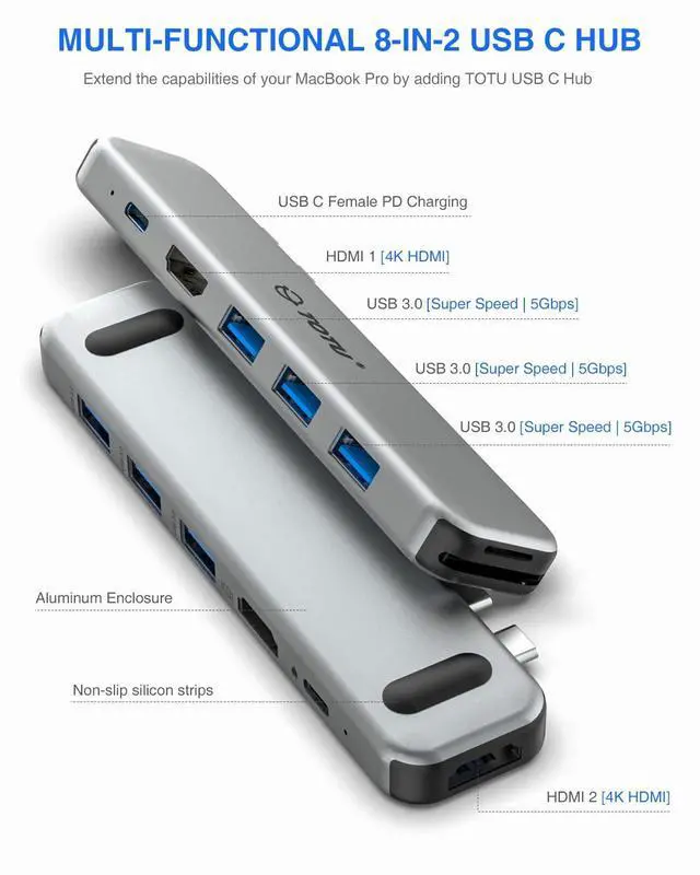 8 in 2 USB C Hub For MacBook Pro & MacBook Air: TOTU USB C hub multiport adapter is specially designed for MacBook Pro 2016 - 2021, MacBook Air 2018 or later version. Equipped with dual 4K HDMI ports, 92W USB-C power delivery port, 3 USB 3.0 ports, SD&TF card reader slots.