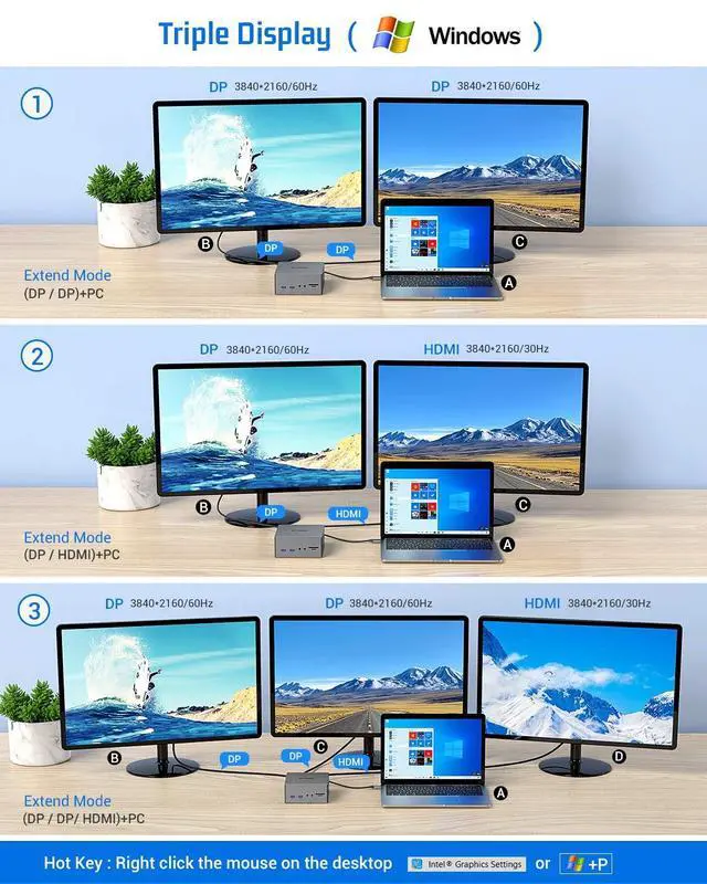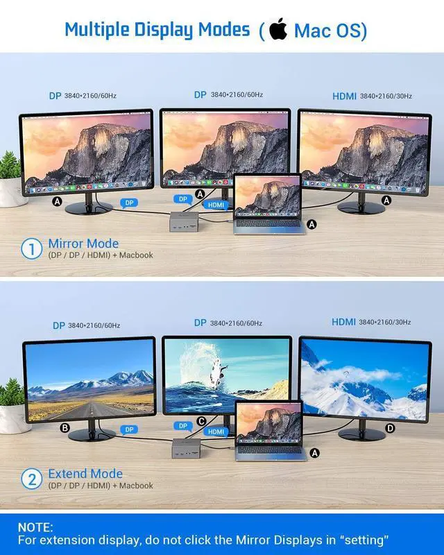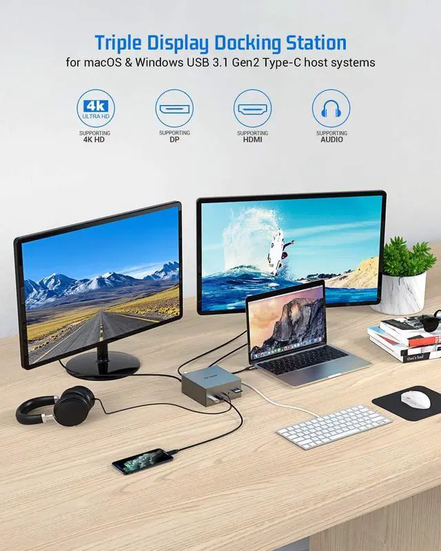 To use this product, the host device USB-C port must support DisplayPort Alt Mode and Power Delivery. Driver is needed for TOTU triple display docking station. Please email TOTU service or go to DisplayLink official website to download the driver. ^^ TOTU Docking Station compatible with macOS & Windows USB-C systems. With up to three additional displays via 2 DP&1 HDMI and up to 60W of charging power. Utilizes USB 3.1 in connection with the latest features of TOTU Triple Display Docking Station. ^^ Triple display for Windows and macOS. DisplayPort outputs and Gigabit Ethernet via DisplayLink DL-6950 "Alt Mode".