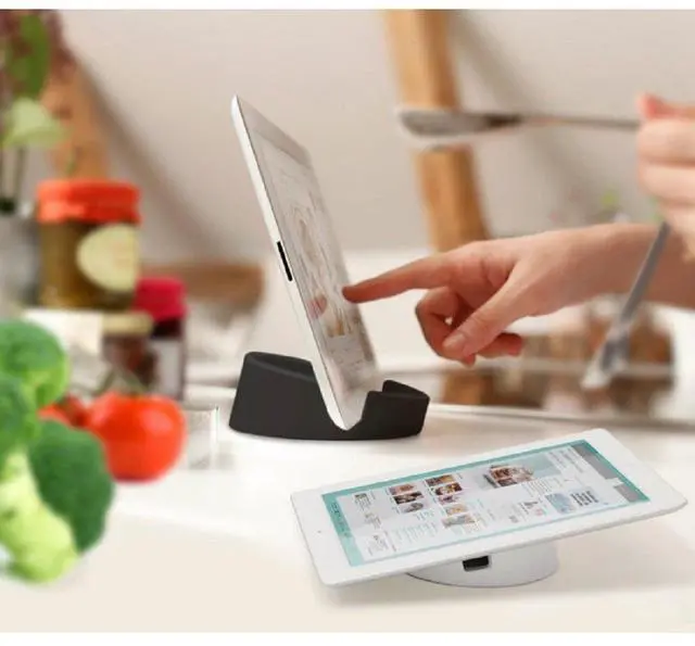 Our Kitchen Tablet Stand has been especially designed and developed to fit into the kitchen environment and its demands for modern home chefs who search for recipes, watch cooking videos, listen to music while cooking. Your iPad can be placed both standing and lying down. Tablet Stand's soft and non-slip surface makes the tablet securely rest on top without sliding off. To meet demand of food safety, Tablet Stand is entirely made from food grade recyclable silicone.