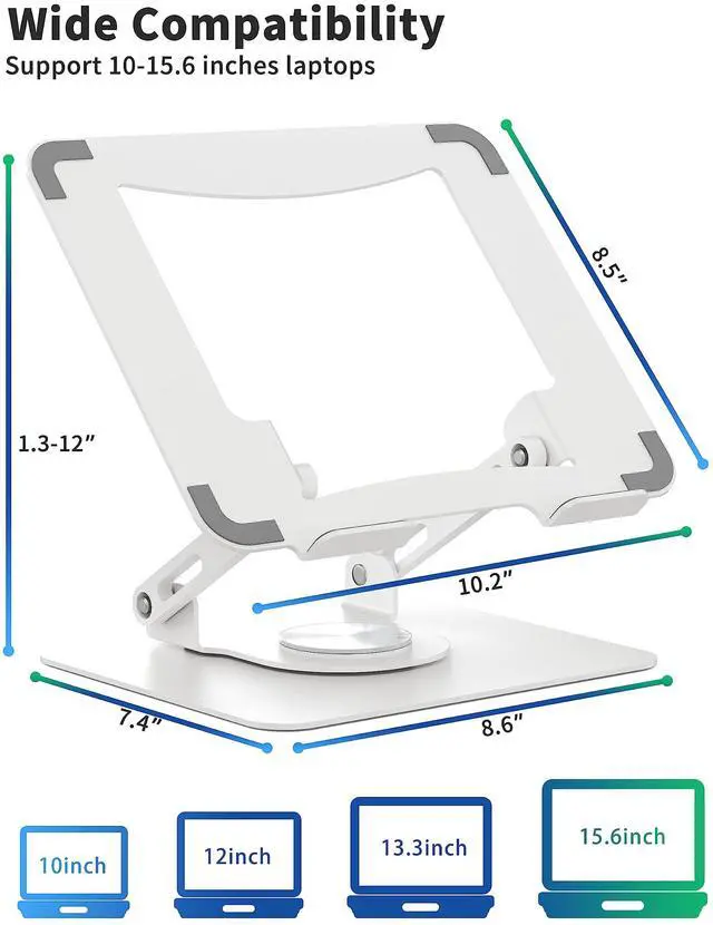 SOUNDANCE Laptop Stand with 360deg Rotating Base, Ergonomic Computer Riser for Desk, Adjutable Height Muti-Angle, Foldable Laptop Mount, Stable Metal Holder Support 10- 15.6" Notebook PC, White