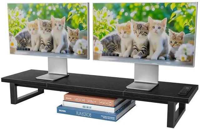 Simple Trending Dual Monitor Stand Riser with 2 USB Charging Ports, Computer Desk Organizer for 2 Monitors, Extra Long TV Stand for Laptop Office, iMac, Black