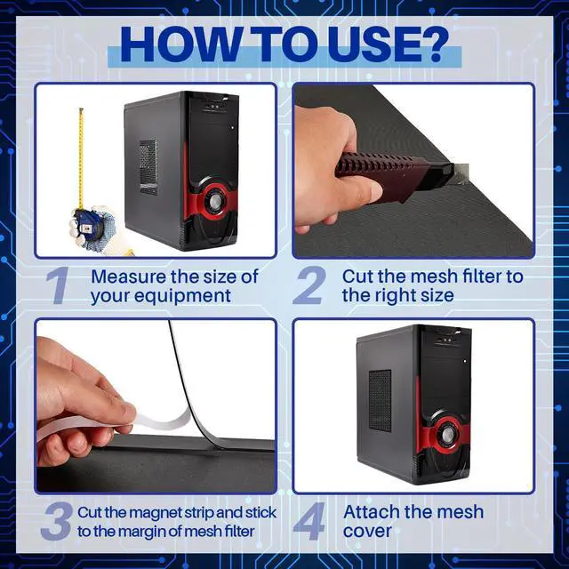DIY Your PC Dust Filter: this PC dust filter is about 39.37 x 11.81 inches/ 100 x 30 cm; You can cut out the appropriate size according to the size of the fan opening of your computer case, and stick mesh dustproof cover on the iron case with a magnetic strip
