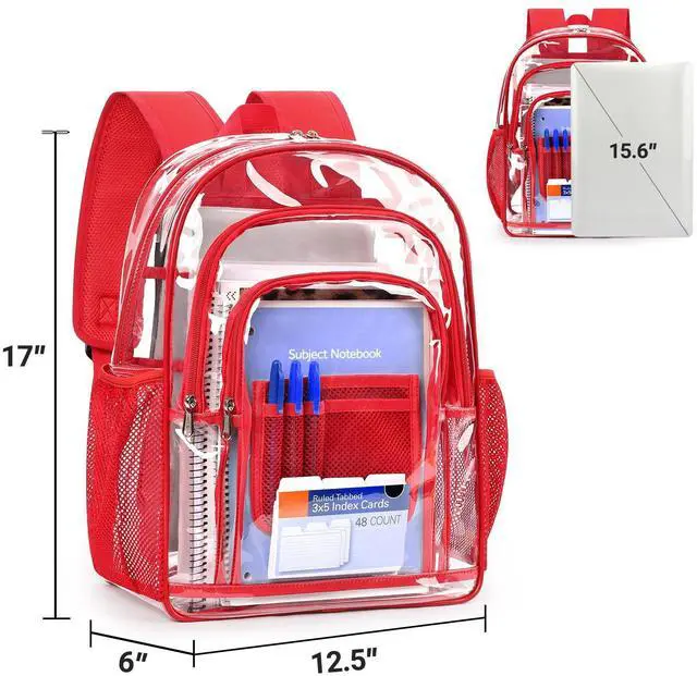 [(Large Clear Backpack)] : Measuring 17 x 12.5 x 6 inches, this clear bookbag includes a main compartment with a laptop sleeve for 15.6-inch laptops and A4 folder, plus two small pockets for a phone, keymouse, and charger. A medium front compartment features 4 mesh slots for pencil cases and pens, along with an additional compartment for small items. Plus, the see through backpack offers two side mesh pockets for water bottles or umbrellas