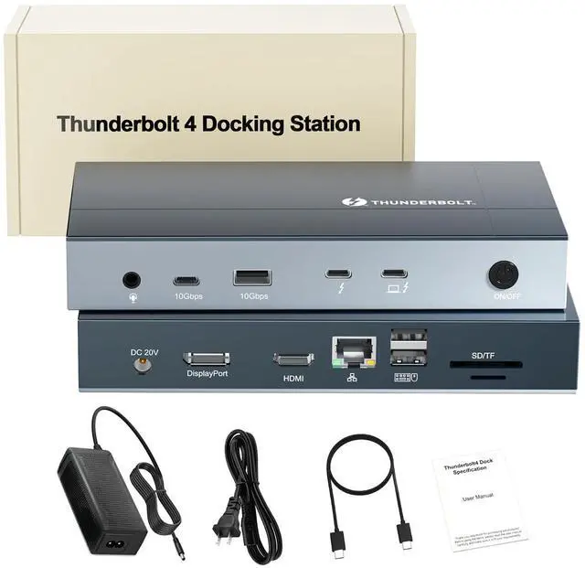 Thunderbolt Certified & Versatile PerformanceOfficially recognized as the Thunderbolt Dock, this Thunderbolt docking station is equipped with 13 high-performance ports, 8K DisplayPort , 8K USB C with 40Gbps data port, 4K HDMI, 100W DC Power Delivery (power adapter included), Gigabit Ethernet, SD TF Ports.