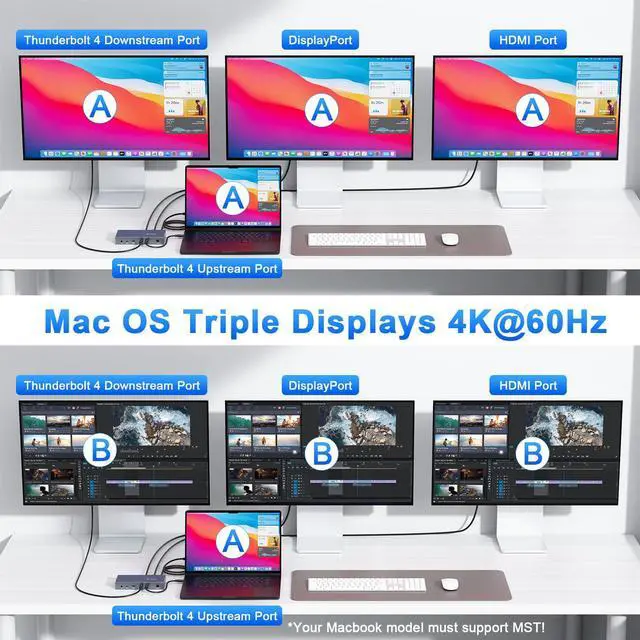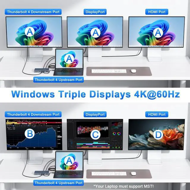 Triple 4K or Single 8K Display SupportMaximize multitasking with a laptop docking station that powers three 4K 60Hz monitors(HDMI+DP+Thunderbolt C), or a single 8K display via Thunderbolt C or DisplayPort; Perfect for creative, professional, and remote workflows.