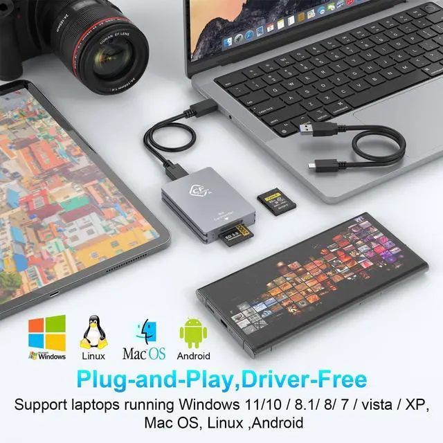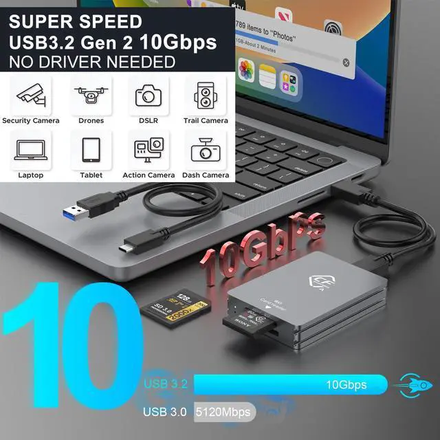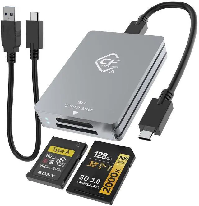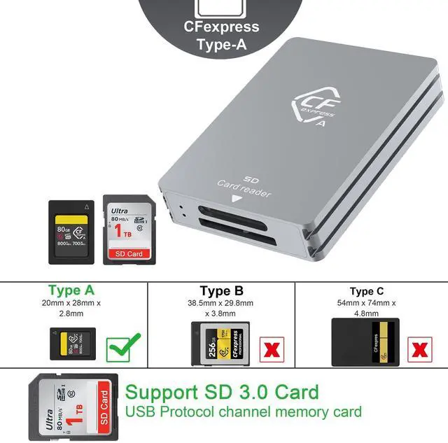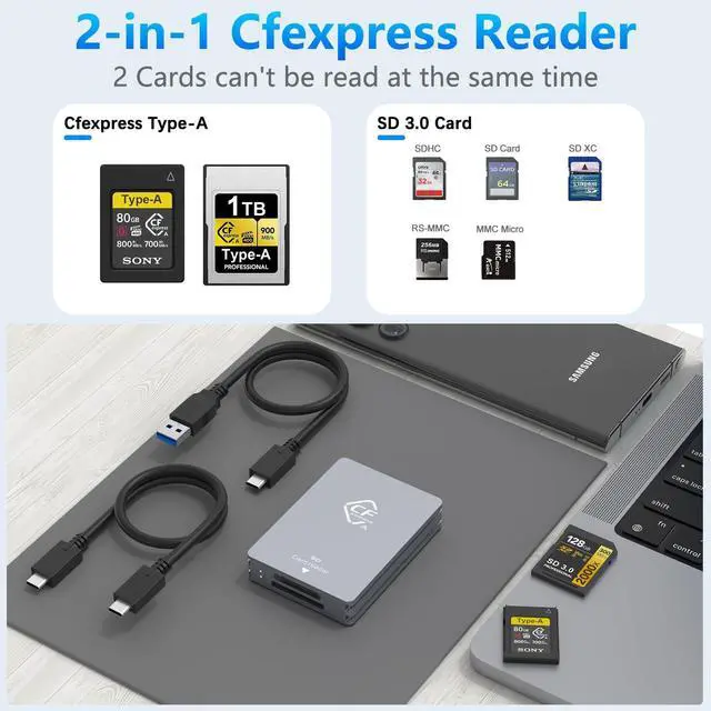 2 in 1 CF express Card Reader Type A Specially designed for the CFexpress (Type A) memory card. Not only compatible with CFexpress Type A Card, but also work with SD, SDXC, SDHC, UHS-I, UHS-II Cards. ^^ Super Fast Transfer Speed The 3.2 Gen 2 CFexpress Type A and SD dual-slot memory card reader transfers your data at lightning speed - up to 1.25GB /s (10 gbp/s), you can spend more time creating and less time waiting on downloads. Metal dual cfexpress adapter is precision engineered to survive the toughest conditions you can face it, yet work faster than the rest.