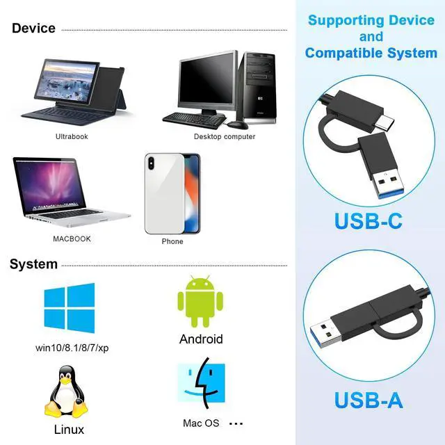 • 2-IN-1 Connector DesignSD card reader adapter has multiple interfaces, comes with USB/USB C connectors. Type-C connector for iPhone 15 15Pro 15Plus, Samsung Galaxy S24 S23 S22 S20 S10 S9 S8 Note 9 8, LG G5 G6 V20, Chromebook, Google Pixel, Google Nexus 5X 6P, Huawei. USB A connector for all most PC, Laptop, Tablet amd Computers.