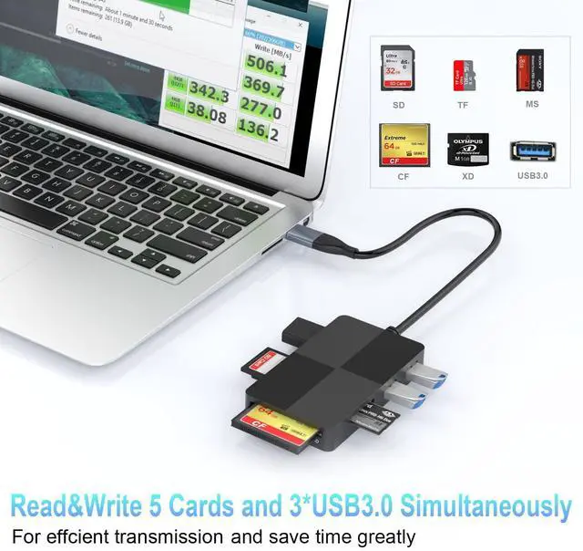 Compatible with most systems--Mac OS, Android, Linux, Chrome OS, Windows XP/Vista/7/8/ 8.1 /10, 11, etc. ^^ 5Gbps Super Speed Transfer5Gbps data transfer, finished in a blink. You can transfer your images and videos from your card to the computer soon, save a lot of time and improve your work efficiency. Also the USB 3.0 card reader is compatible with the USB 2.0 / 1.1 Port. ^^ Broad CompatibilityThis USB C & USB 3.0 card reader hub supports CF card, high-speed CF (UDMA), SD card, SDXC (up to 2 TB), SDHC, micro SD, micro SDXC, micro SDHC, TF, MS, XD memory cards, etc.
