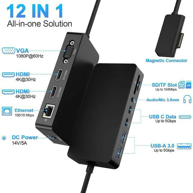 Broad Compatibility with Surface ModelsDesigned with a dedicated side-connector, this docking station is compatible with Surface Pro 12/11/10/9/8/X/7/6/5/4/2017, Surface Laptop 7/6/5/4/3/2/1, Surface Laptop Go 3/2/1, Surface Go 4/3/2/1, and Surface Book 3/2/1. (Please connect the power adapter during use. ) ^^ 12 IN 1 Versatile Docking StationEquipped with dedicated side-connector design, this docking station offers a range of connectivity options for all your peripherals with 2x HDMI*4K@30Hz, VGA*1080P@60Hz, 100Mbps RJ45 Ethernet port, 2x USB C data port, 2x USB A 3.0 Ports, SD/TF card slot, 3.5 mm Headphone Jack Port, DC Power Port, offering simple plug and play connectivity.