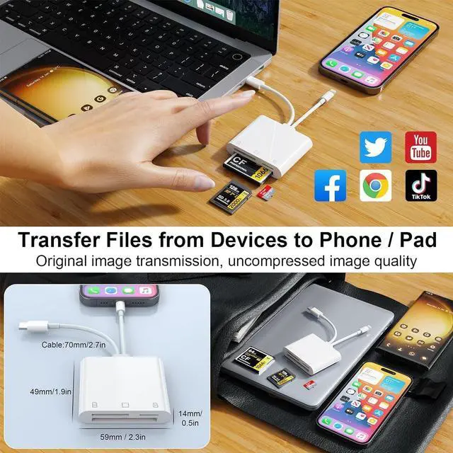 3 in 2 SD/TF/CF card readerThe multifunctional 3-in-2 card reader for iphone includes a CF card slot, an SD card slot and a TF card slot, and is equipped with USB C and Lightning ports to support all iOS 12.0 and above iPhones as well as other devices with Type-C/USB-C ports. ^^ Design for Lightning/USB C DevicesThis card reader for iPhone/iPad and USB-C devices, Lightning port for iPhone 14/13/13 Pro/12/12 Pro/11/11Pro/XS/XS Max/XR/8/7, Pad4, Pad Air, Pad mini. Type-C port for iPhone 15/15Pro, Samsung Galaxy S10 S9 S8 Note 9 8, LG G5 G6 V20, Google Pixel, Google Nexus 5X 6P, MacBook Air/Pro, Surface Pro 9/8, Huawei P9 10 and more USB-C devices.