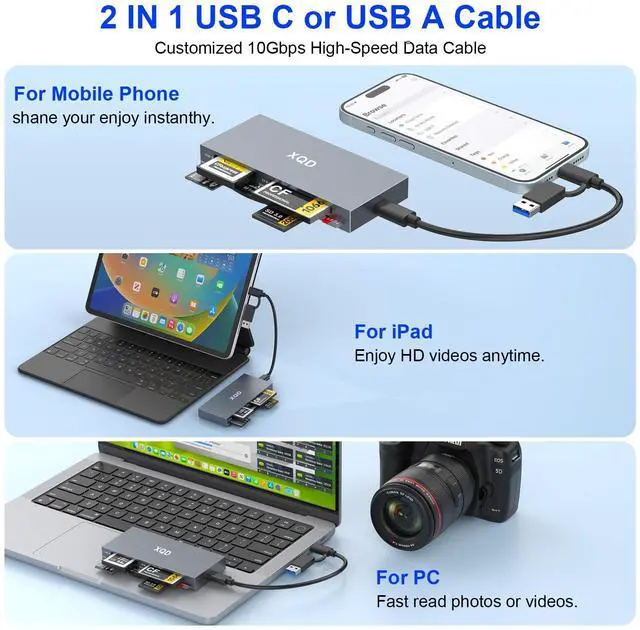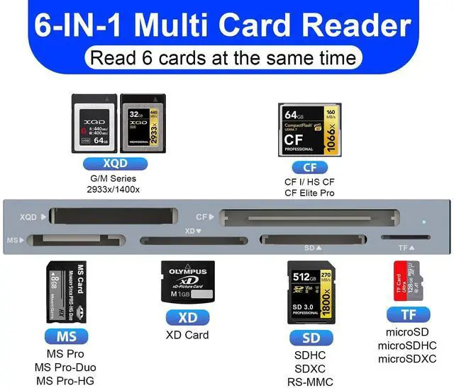 8-in-1 XQD Card ReaderThis multi card reader is equipped with 1* XQD, 1*SD, 1*TF, 1*CF, 1*MS, 1*XD card slots, which is the perfect card reader for photography enthusiasts to realize the data reading and transfer. Considering various functional requirements, 10Gbps USB card reader can read up to 6 cards at the same time, eliminating the need for multiple switching transfers for multi-card transfers, which is a great convenience for those who enjoy photography and use XQD cards for storage. ^^ SuperSpeed 10GbpsThe latest USB 3.2 (USB 3.2 Gen2) technology supports up to 10Gbps data transfer for memory cards(backward compatible with USB 3.1 Gen 1).