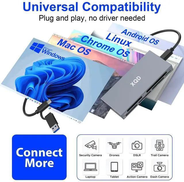 The USB 3.2 Gen 2 Multi card reader is compatible with Mac/Chrome OS/Linux/Android/Windows XP/Vista/7/8/ 8.1 /10/11. No driver required. ^^ Perfect size and easy to carryXQD reader is 4.4 in long, 1.92 in wide, 0.5 in high, palm size and weighs only 0.13 kg, travel photography can be carried to support outdoor, mountain tops and other places at any time, make photography more simple. The memory card reader is designed with aluminum alloy shell, the all-metal design is not only exquisite and compact in appearance, but also has the advantages of strong heat dissipation, pressure and shock resistance.