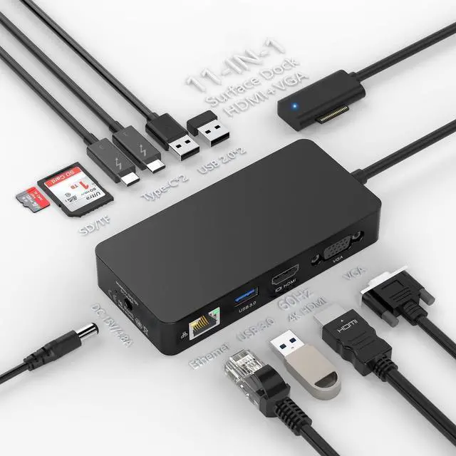 11 IN 1 Multi-Functional Surface DockEquipped with Surface Connection technology, this Surface docking station offers a range of connectivity options for all your peripherals with 4K@60Hz HDMI ports, 1080P@60Hz VGA port, 100Mbps Gigabit RJ45 port, USB A 3.0 Port, 2x USB C data port, 2x USB A 2.0 Ports, SD/TF card slot, 72W DC Power Port. Our surface dock with simple plug and play connectivity. ^^ Plug & Play for Surface DeviceThe surface docking station with magnetic surface connect cable. Transform your surface into a desktop PC by plugging in your dock with the surface connect cable.