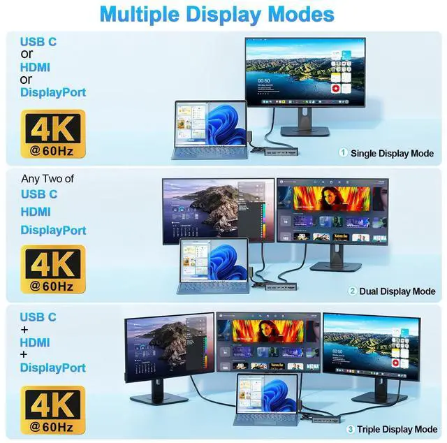 ^^ Ultra HD 4K@60Hz Output & Triple Displays Dock HubTriple Displays(4K@60Hz HDMI + USB C+ DisplayPort) with extend or mirror mode, boost your efficiency 3 times, Pro Dock Provide your device with excellent 4K HDMI+USB C+DP ports. HDMI supports resolutions up to 3840 x 2160@60Hz. USB C Video port supports display resolutions up to 3840 x 2160@60Hz. DisplayPort supports resolutions up to 3840 x 2160@60Hz. ^^ Super Speed Data Transfer Pro Docking StationThis Pro docking station comes with 2*USB A 3.0 (5Gbps) and 2*USB C data (5Gbps) ports, allows you to connect keyboard, mouse, USB flash driver, USB C hard disks, etc.
