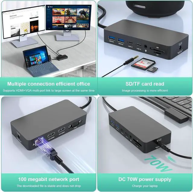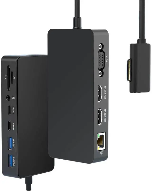 Note: When you need to connect 3 monitors, you need to turn off the screen. ^^ Dock USB 3.0 f+USB C 3.0 + 3.5MM + SD/TF Port dock station is equipped with 2*USB 3.0 and 2*USB-C 3.0 ports (up to 5Gbps), which can be easily connected to smartphones, tablets, and hard drives for data transfer, and instantly complete fast file transfers. 1* 3.5 mm music jack, giving you a wonderful The accessory is also equipped with SD and TF slots, perfect for photography enthusiasts. ^^ dock Broad CompatibilityThis docking station for pro features connection technology for great compatibility. docking station is widely compatible with Pro 9/8/X/7/6/5/4/2017, Laptop 5/4/3/2/1, Laptop Go 3/2/1, Microsoft Laptop Studio 2/1, Book 3/2/1. 9 dock station has all the interfaces you could possibly need to add value to your work. ^^ Easy to use Microsoft docking station12-in-1 multifunction pro docking stations is a plug-and-play design that does not require any drivers or software; simply connect your peripherals to the pro accessories and then connect the magnetic connector cable to your device to complete the operation.