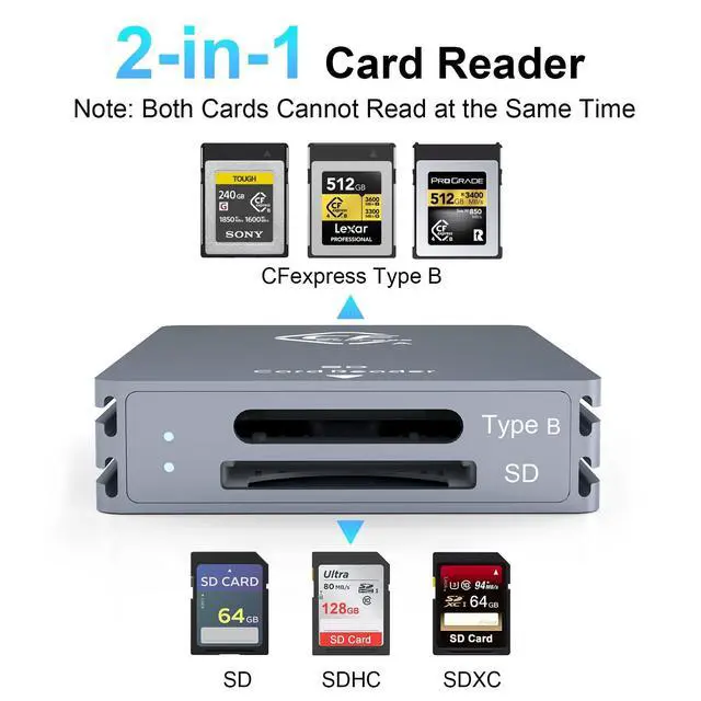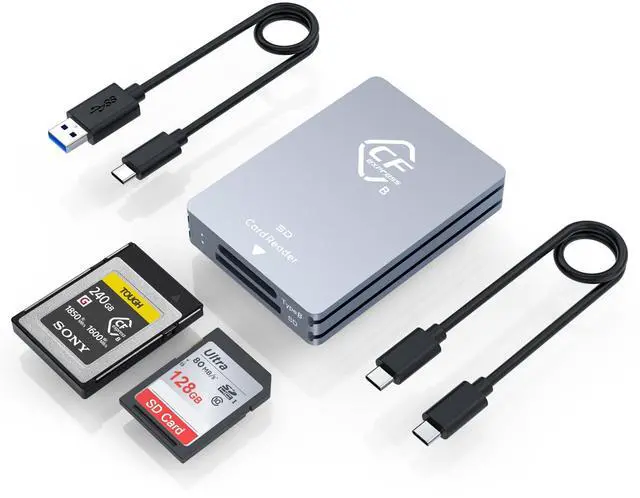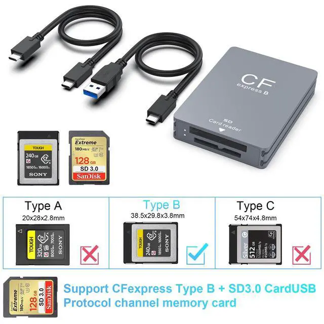 (Note: both cards cannot read simultaneously) ^^ Specially Designed for CFexpress Type B CardThis card reader is specially designed for the CFexpress (Type B) memory card. Provide great convenience for those who love photography or videography and use CFexpress card. ^^ SD Card CompatibilityNot only compatible with CFexpress Type B Card, but also work with SD, SDXC, SDHC, UHS-I Cards for your convenience. Plug & play, hot-swapping capability, easy and convenient to carry and use for photographer and videographer. ^^ Board CompatibilityCompatible with most systems such as Windows XP/Vista/7/8/ 8.1 /10/11, Mac OS, Linux, Chrome OS, Android. Also this CFexpress card reader is compatible with most devices--not only USB type C device but also USB A device. ^^ What You Will Get1 x CFexpress Type B & SD 3.0 Card Reader, 1 x USB-C TO C Cable, 1 x USB-C TO A Cable, 1 x User Manual, 1-year and friendly customer service. Please feel free to contact us at any time.