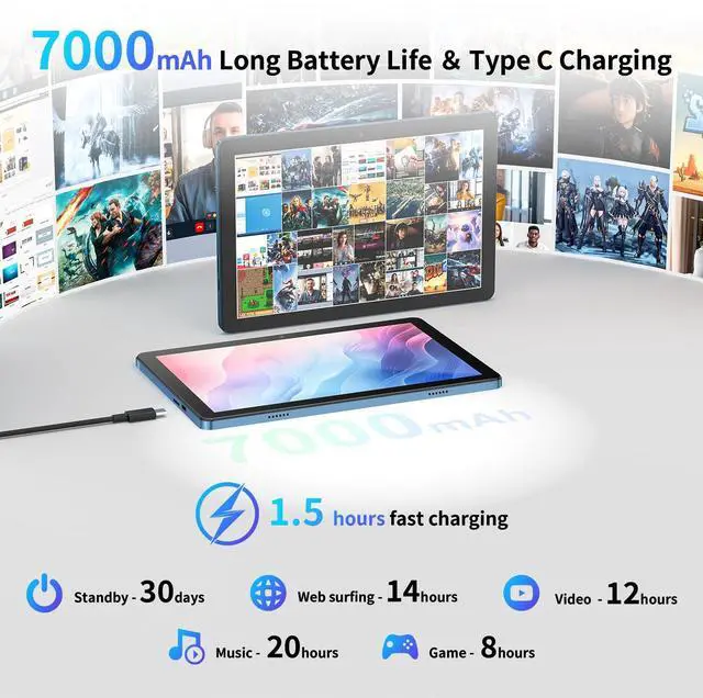 Long-Lasting 7000mAh Battery for All-Day Use: With a powerful 7000mAh battery, this tablet ensures up to 8 hours of continuous use, whether you're streaming movies, gaming, or browsing. The fa