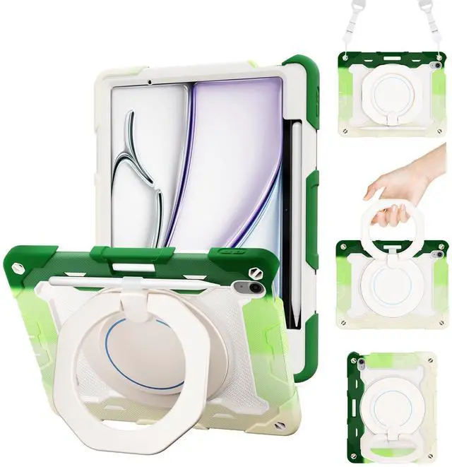 ACEMO for iPad Air 13 Inch Case M3 2025 & iPad Air 13 Inch M2 2024 with Pencil Holder/ 360deg Rotating Kickstand/Grip Handle/Shoulder Strap for Kids Girls Heavy Duty Rugged Protective Cover, Green