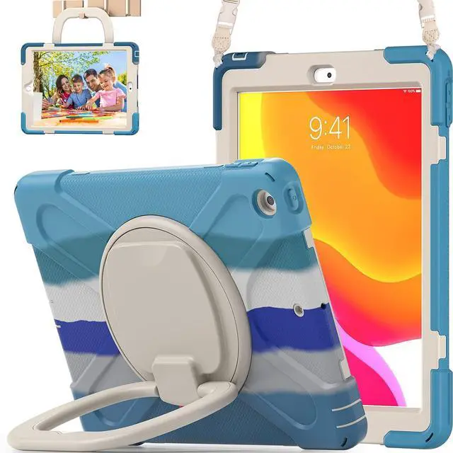 LX-SUNCX for iPad 10.2 Case 9th Generation 2021 / 8th Gen 2020 / 7th 2019,Shockproof Kids Case with Screen Protector,Rotating Stand/Pencil Holder/Shoulder Strap for iPad 10.2 Inch - Colourful Blue