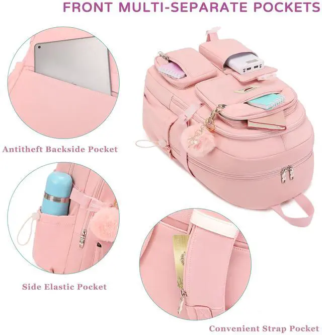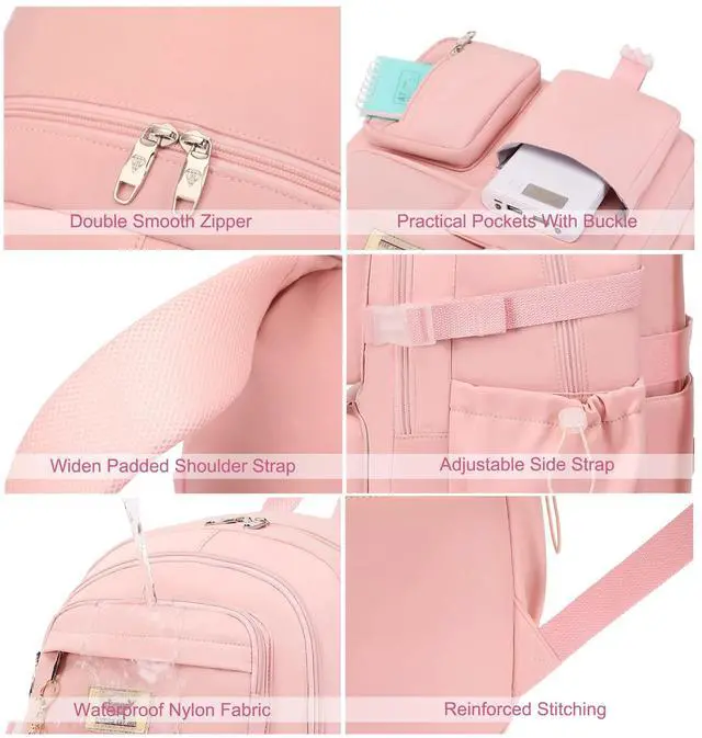 Laptop Backpack 15.6 Inch Elementary Middle High School Bag College Backpacks with Lunch Box Pencil Pouch 3 PCS Set Travel Bookbags for Teens Girls Women Students (Pink)