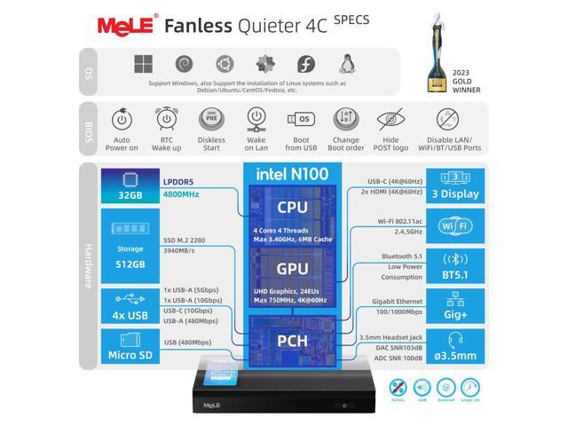 MeLE Mini PC Quieter 4C - 12th Gen N100, Fanless PC, 32GB Memory, 512GB Storage,with Windows 11 Pro, 2.4/5G Wi-Fi, Full-Functional USB-C, 4K Triple Display Desktop