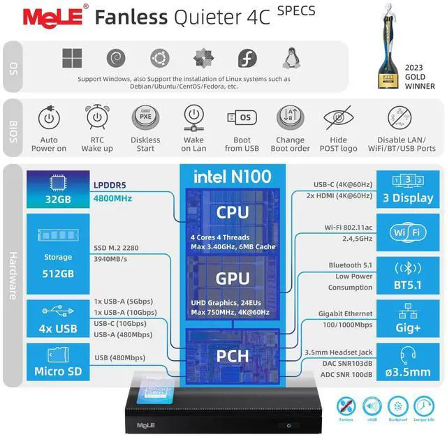 MeLE Mini PC Quieter 4C - 12th Gen N100, Fanless PC, 32GB Memory, 512GB Storage, with Windows 11 Pro, 2.4 /5G Wi-Fi, Full-Functional USB-C, 4K Triple Display Desktop