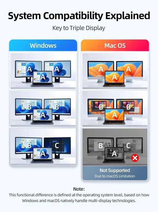 System Compatibility Explained: The MST multi-display functionality of the llano splitter varies by operating system It supports full triple-display modes (AAA, ABB, ABC) on Windows However, on macOS, due to Apple's native display architecture, it is limited to mirroring or partial extended modes (ABA, ABB) This functional difference is defined at the operating system level ^^ Dual 4K