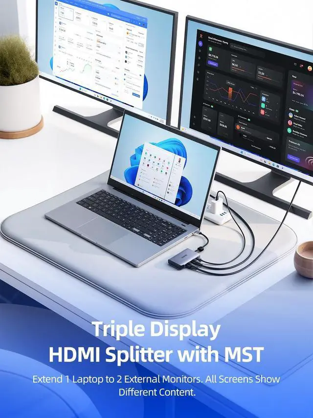 Triple Independent Displays: The llano splitter utilizes core DisplayPort MST technology to expand a single USB-C port on your laptop into two independent video streams, driving two external 4K@60Hz monitors. Combined with your laptop's own screen, it creates a seamless triple-extended display system for synchronized work, allowing windows to be dragged freely across all screens, dramatically expanding your visual workspace and productivity ^^