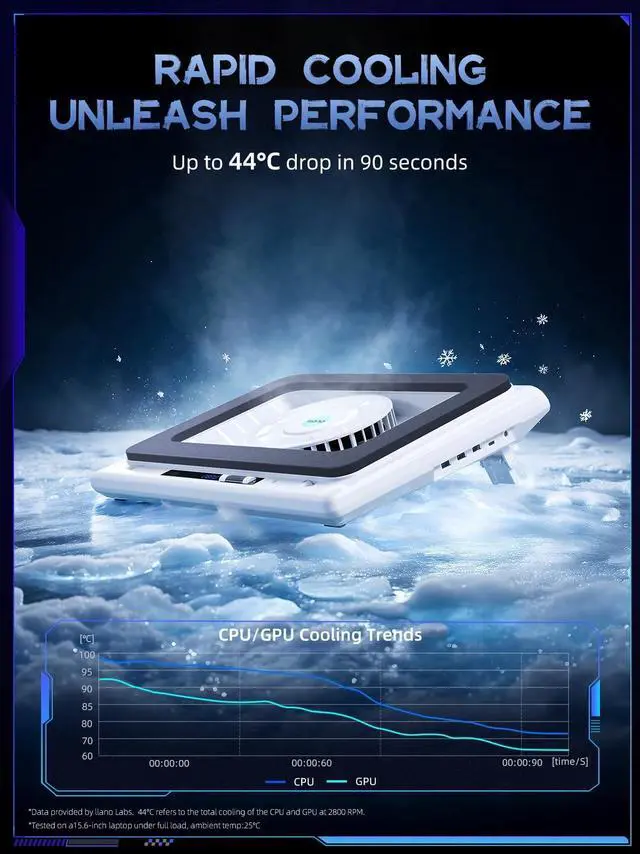 Cooling]: The llano New Upgraded Version ice cooler boasts a powerful 5.5 inch (14CM) large-diameter turbo external fan, ensuring an impressive 44 (111) temperature drop (CPU+GPU) in just 90 seconds. Whether immersed in intense gaming sessions or tackling high-demand tasks, enjoy uninterrupted, rapid cooling without delays or screen flickers.
