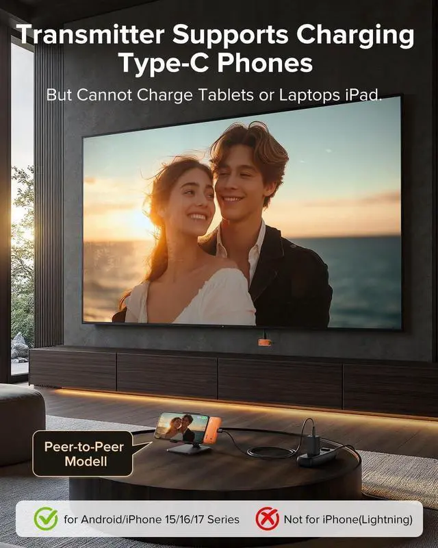 Charge While You Use: Solving the problem of traditional wireless hdmi products, the new Type-c charging port allows you to charge smartphones, laptops, and more while you use them without the need for an external power source. ^^ Wireless Mirroring and