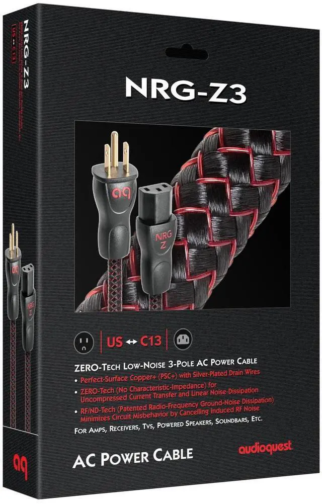 NRG-Z3 AC Power Cables feature direction-controlled Semi-Solid Concentric Perfect-Surface Copper+ (PSC+) conductors, ZERO-Tech, & RF/ND-Tech, minimizing the noise of your A/V system.