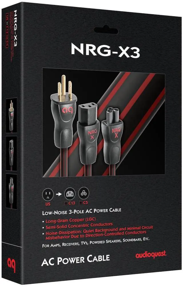 NRG-X3 AC Power Cables feature direction-controlled Semi-Solid Concentric Long-Grain Copper (LGC) conductors, minimizing the noise of your A/V system.