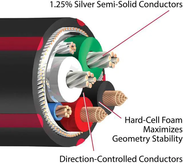 1.25 % Silver Semi-Solid Concentric Conductors ^^ Hard-Cell Foam Ensures Critical Signal-Pair Geometry ^^ Direct Gold-Plated Contacts ^^ Digital-Audio Conductors Controlled For Direction