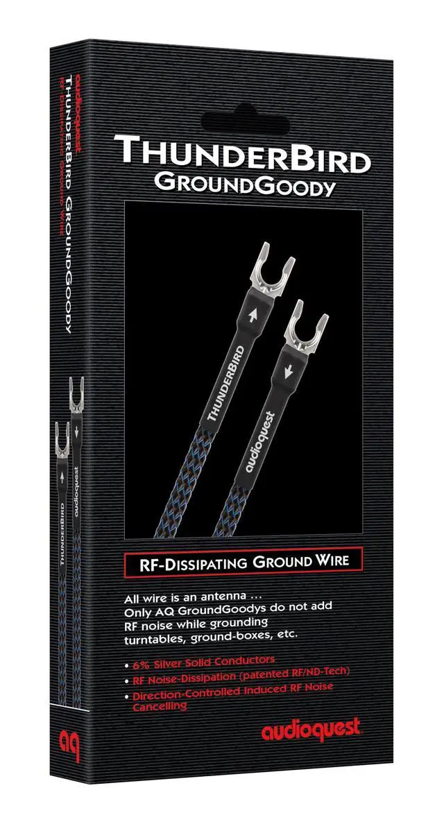 Unlike other ground wires that inevitably act as radio-frequency antennas, AudioQuest ThunderBird GroundGoody ground wire prevents hum while efficiently dissipating radio-frequency noise. ThunderBird GroundGoody uses premium Solid 6% Silver conductors that are controlled for direction and cold-welded to Direct-Silver Plated #10 size spade lugs. Further, AudioQuests patented RF/ND-Tech dissipates and cancels most induced radio-frequency noise. In addition to grounding subwoofers, powered speakers, and more, AudioQuest ThunderBird GroundGoody can be combined with nearly any analog interconnect cable to create a low-distortion phono cable. The exceptions are