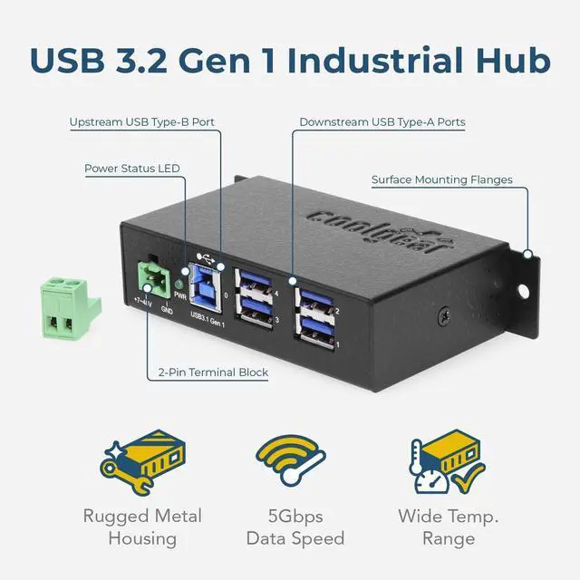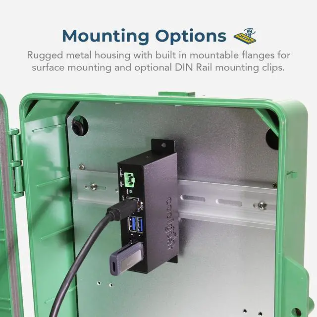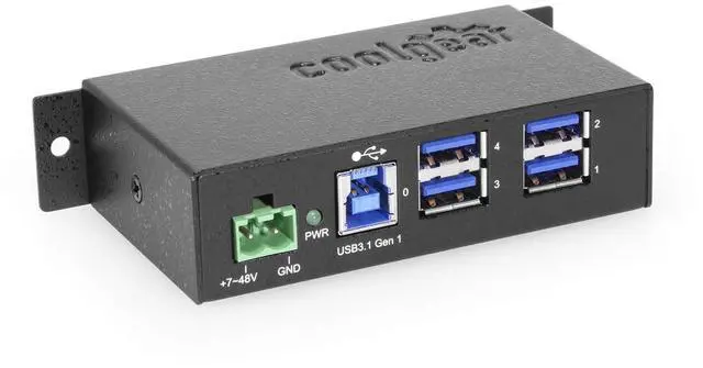 Description Introduction: The Coolgear USB 3.2 Gen 1 hub is a 4 port industrial hub with a small form factor that accommodates up to 5Gbps of data transmission. Its both surface and DIN Rail mountable with its included DIN Rail clips and screws. It supports Windows 7, 8, 8.1, 10, 11 Linux, and Mac OS10. X operating systems and supports 5 hops to cascade with other hubs. The USB 3.2 Gen 1 4 port hub is small enough to fit in the palm of your hand yet can handle large amounts of super-speed data from its downstream ports. Each of the USB 3.2 Gen 1 ports supports the battery charging specification 1.2 for normal charging at. 900mA per port. Normal charging allows the USB hub to charge low power devices that depend on charging to operate. Operating USB equipment such as printers, scanners, portable drives, virtual reality gear and others are not a problem with this USB 3.2 Gen 1 hub. Package Contents USB 3.2 Gen 1 Port Hub DIN Rail Clip and Mounting Screws 6ft. USB A to B USB 3.2 Gen 1