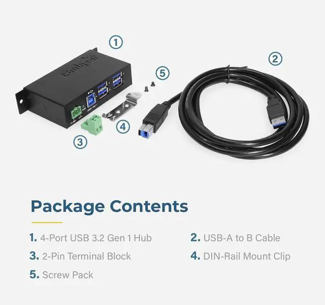 Package Contents: USB 3.2 Gen 1 4 Port Hub DIN Rail Clip and Mounting Screws 6ft. USB A to B USB 3.2 Gen 1 Cable *Surface Mounting screws not included.