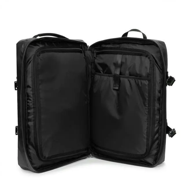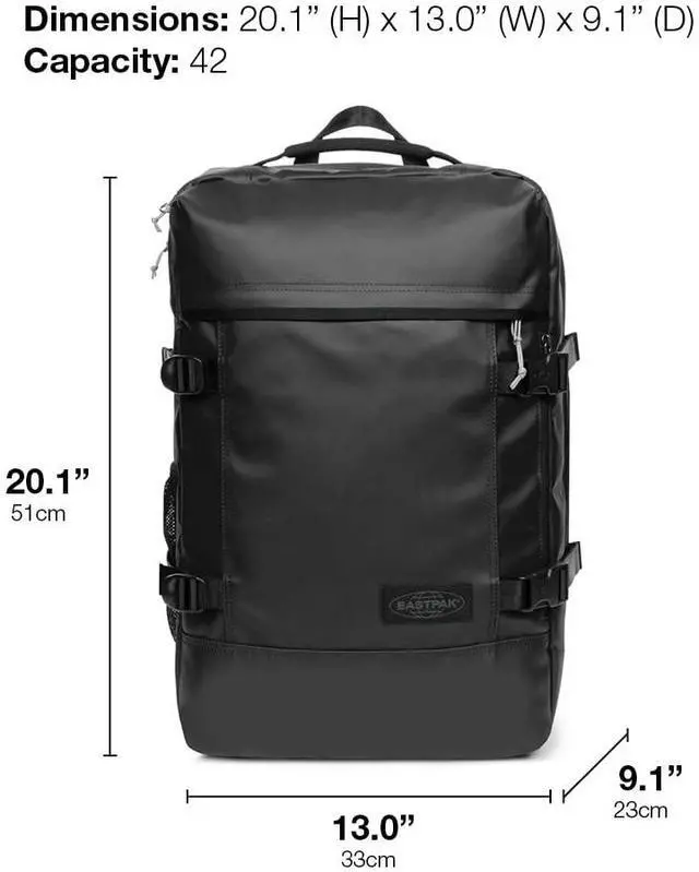 Built for flexibility and functionality, the Eastpak Travelpack is a 42L cabin-size duffel backpack thats perfect for weekend getaways and overseas adventures. This 2-in-1 travel essential features two main compartments for organized packing, a front zip pocket for quick-access items, and a padded laptop sleeve that protects most 17" devices while you're on the move. Carry it your wayeither as a backpack with the adjustable padded shoulder straps, or as a duffel using the side carry handles. Made from 100% polyester, this water-resistant, vegan-friendly bag is designed for durability and comfort.
