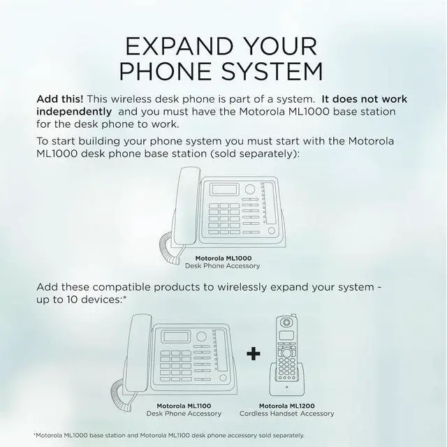 Building a system is easy! Build a system of up to 10 ML1100 desk phones and / or ML1200 cordless handsets (sold separately) with one phone jack. Connect deskphones and cordless handsets - all wirelessly. This wireless desk phone is part of a system. It does not work independently. You must have the Motorola ML1000 Base Station for your phone system to function.