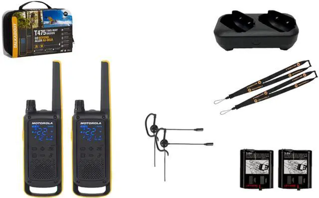 Motorola Solutions T475 GO BEYOND The TALKABOUT T475 is the rugged travel companion you need. With an IPX4 rating, the T475 is weatherproof - able to withstand harsh environments. A built-in LED flashlight makes its possible to get where you need to in the dark. The Quiet Charge feature allows T475 to receive NOAA weather/emergency alerts while keeping calls silent during charge. And with essential accessories and a range of up to 35mi, the TALKABOUT T475 keeps you in touch whether youre on the roughest treks or highest peaks. How far can I expect my radios to communicate? The communication range quoted is calculated under optimum conditions, with an unobstructed line of sight.