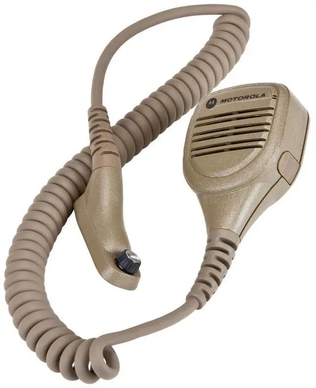 Motorola Solutions NNTN8236A Federal Military tactical combat remote speaker microphone for use with SRX2200 radio. IP54 rating, 3.5 mm jack, Windporting technology for better performance. Coyote brown SRX2200 models. Intrinsically-safe rated. New in box. Serial Number on mic