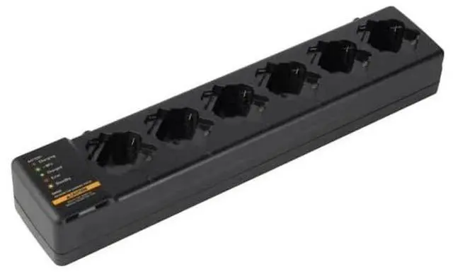 PMLN7101A PMLN7101 - Motorola Six-Pocket Multi-Unit Charger, US Plug Charge up to six radios or batteries simultaneously with this compact, multi-unit charger. Each pocket on the charger includes an LED indicator, providing charge status on each battery. Includes US/NA power supply.