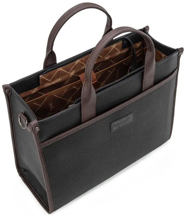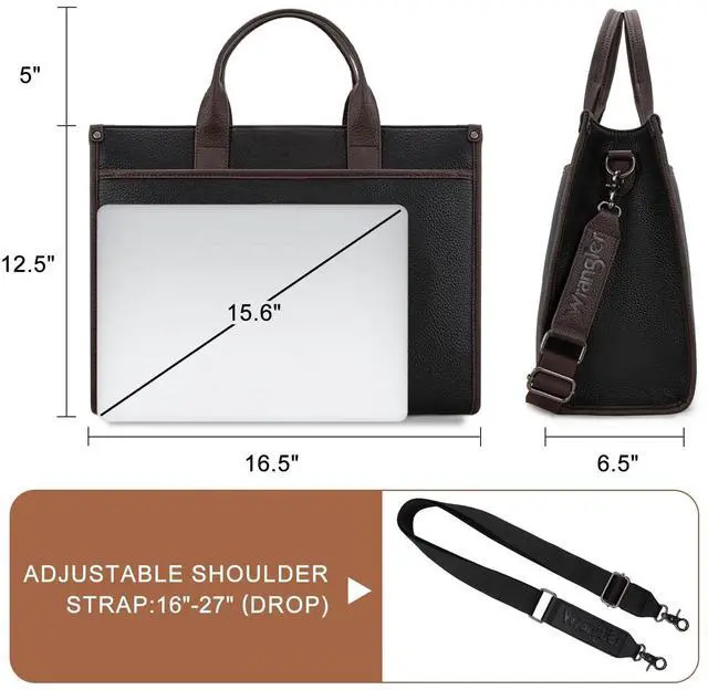 ORGANIZED STORAGE: Spacious main compartment with dedicated laptop sleeve and exterior pockets for quick access to frequently used items ^^ WRANGLER BRANDThe Wrangler branding adds a touch of authentic Western heritage to this contemporary business accessory. Whether you're carrying your laptop, documents, or daily essentials, this tote combines combine durability with professional elegance, making them a must-have companion for work or school.