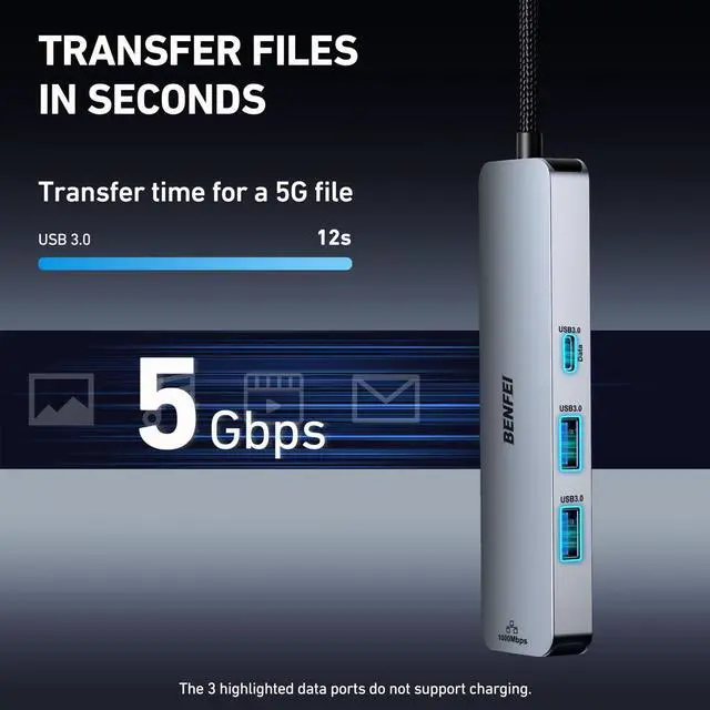 Powerful USB-C HUB with 18 Month warranty BENFEI USB Type-C HUB, with super-soft and knot-free silicone woven design cable, meets most mobile office needs. Compact, lightweight, stylish, and powerful portable USB C Hub equipped with 1 x HDMI port, 1 x 100W charging, Gigabit Ethernet, 2 x USB 3.0 ports, 1 USB-C data port. 18-month warranty, 24-hour response, to ensure you feel at ease when using our product. ^^ Design centered on comfort and reliabilityThanks to BENFEI's end-to-end in-house cable production capability, in-house PCBA and assembly capability, using the industry's most advanced silicone woven design and process, 20cm cable in length, no knots, super-soft, the HUB is easy to use in all scenarios: laptop, tablet, stand etc. Super-soft, 25000+ life cycles, to meet your daily carrying and office needs. ^^ 4K Video with 100W ChargingSupports resolutions up to 3840*2160@60Hz including, 2K@144Hz, 1080P, 720p, 1600x1200, 1280x1024 for high definition monitors or projectors; Support up to 90W USB C pass-through charging via Type-C port to keep your laptop powered. 10W is reserved for other interface operations. No data and video function on the Type-C port. ^^ Fast Data Access with Gigabit EthernetUse the Ethernet port for a stable Internet connection up to 1 Gbps, transfer and backup your files at speeds up to 5Gbps via 2*USB 3.0 ports and 1*USB-C data port. ^^ Wide CompatibilityCompatible with iPhone 15 Series, 2023/2022/2021/2020/2019 MacBook Pro iMac MacBook, Surface Book 2, Surface Go, HP Envy 13, Pixelbook, Galaxy Book, Samsung Galaxy S8/ S9/ S8 Plus/ S9 Plus/ Note 8/ Note 9, Dell XPS 15 / XPS 13, Chromebook, Chromebook Pixel, Intel NUC and others (see detailed product description section below) ---Kindly