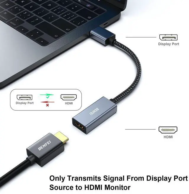 Attention: the displayport to hdmi adapter is uni-directional, not bi-directional. It's not a USB plug, it's a Displayport cord. ^^ Resolution - supports resolutions up to 3840*2160@30Hz, including 1920x1080@60Hz (1080p Full HD), 720p, 1600x1200, 1280x1024, supports flawless audio pass-thru for uncompressed digital 7.1, 5.1 or 2 channels; ^^ Design - Braided nylon cable for extra durability and user-friendly non-slip design for easier plug and unplug. Premium aluminium alloy casing for better heat insulation. Latches-free Displayport connector can avoid damaging ports if forget to depress the button or causing loose connection when the latches fail. ^^ Stability - built-in advanced IC chip ensures the signal stability without flickering or screen lag. Gold plated DisplayPort connector resists corrosion and abrasion and improve the signal transmission performance; Molded strain relief increases cable durability. ^^ Warranty - Exclusive BENFEI Unconditional 18-month Warranty ensures long-time protection of your purchase; Friendly and easy-to-reach customer service to solve your problems timely.