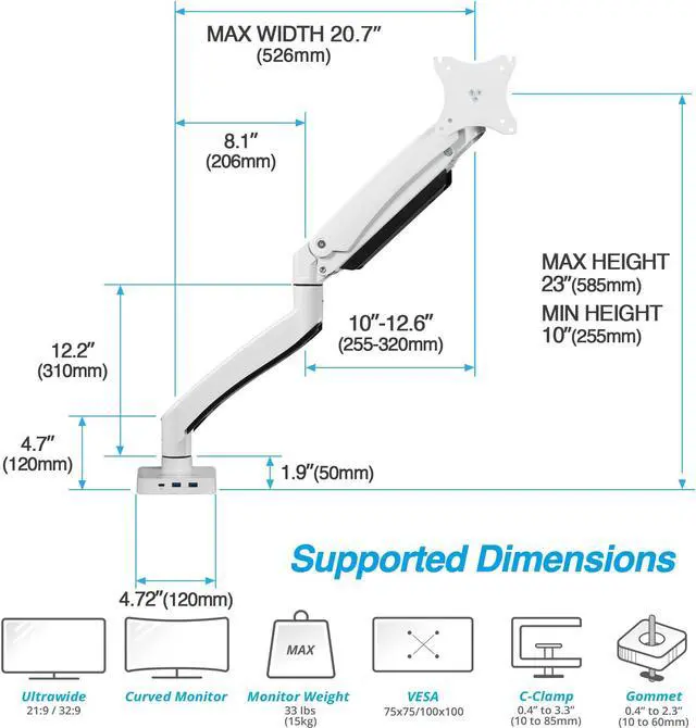 AVLT-DM42-1 SAVE VALUABLE SPACE - Heavy-duty metal base only take up 4.7" x 4.3" (120mm x 110mm) desk surface. The c-clamp and grommet mounting options support up to 3.3" (85mm) desk thick.