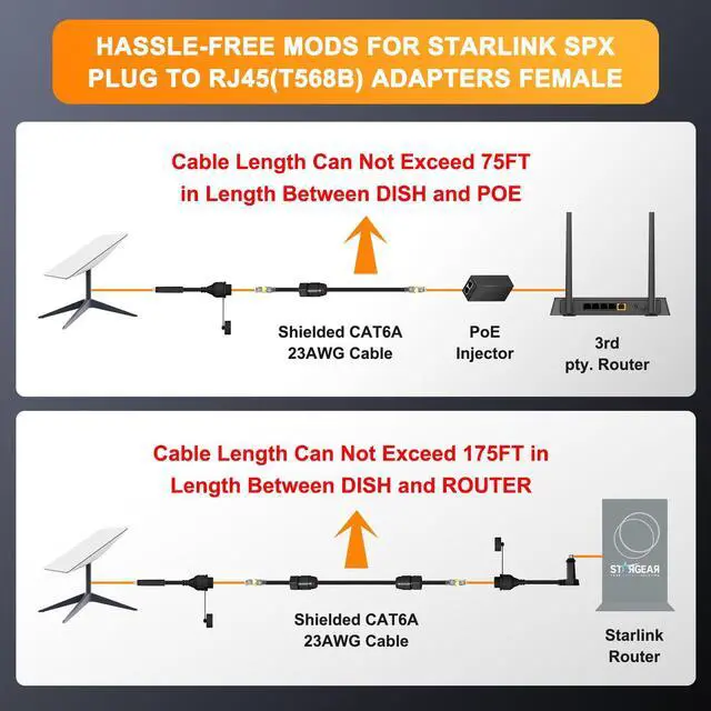 Plug and Play Starlink Ethernet Cable: Plug and Play. Starlink ethernet adapter gen 2 is integrated SPX plug and female RJ45 adaptador (T568B) for both the dish and router. No need to cut and crimp original starlink cables or use additional adapter that adds contact resistance. NOTE: regular ethernet cable is NOT included