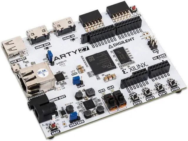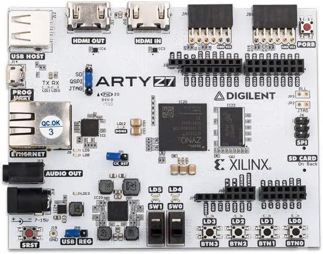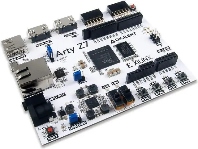 The Digilent Arty Z7 is a ready-to-use development platform designed around the Zynq-7000 All Programmable System-on-Chip (AP SoC) from Xilinx. The Zynq-7000 architecture tightly integrates a dual-core, 650 MHz ARM Cortex-A9 processor with Xilinx 7-series Field Programmable Gate Array (FPGA) logic. This pairing grants the ability to surround a powerful processor with a unique set of software defined peripherals and controllers, tailored by you for whatever application is being conquered. The design process is very straightforward and provides a systematic path between defining your custom peripheral set and bringing it's functionality up to a Linux OS running on the processor.
