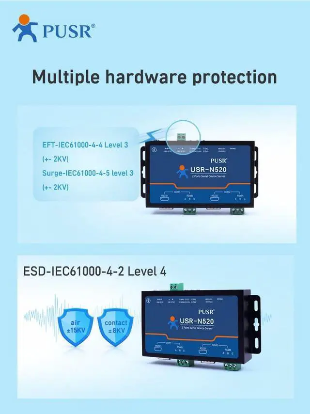 • High Reliability and Stability:EFT-IEC61000-4-4 Level 3(±2KV),Built-in hardware watchdog,ESD-IEC61000-4-2 Level 4